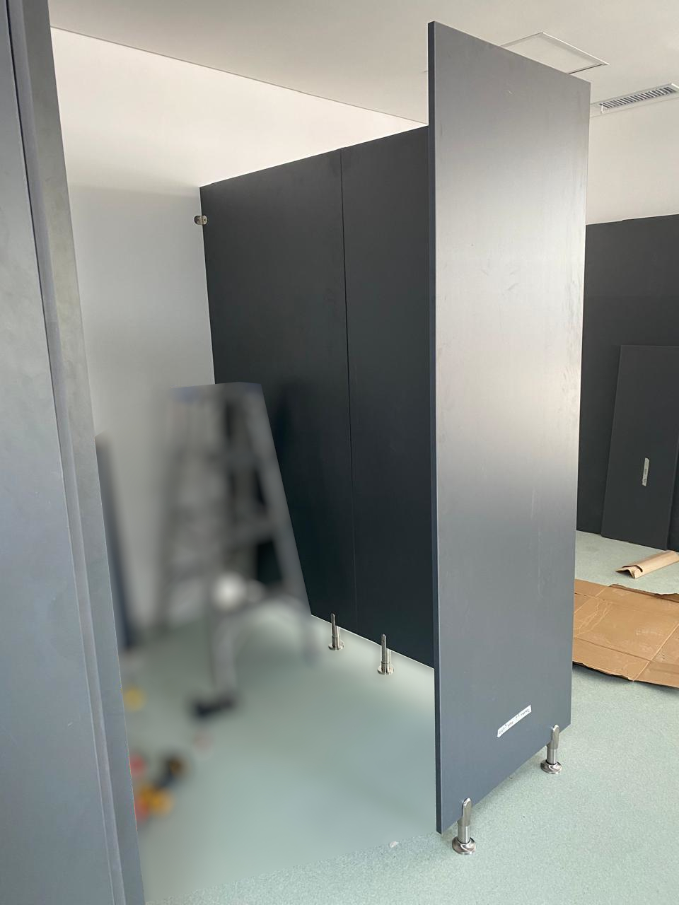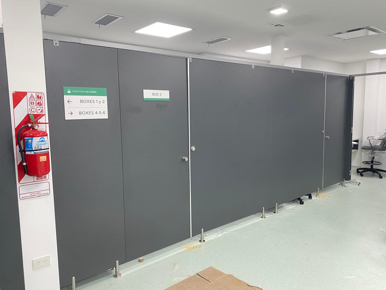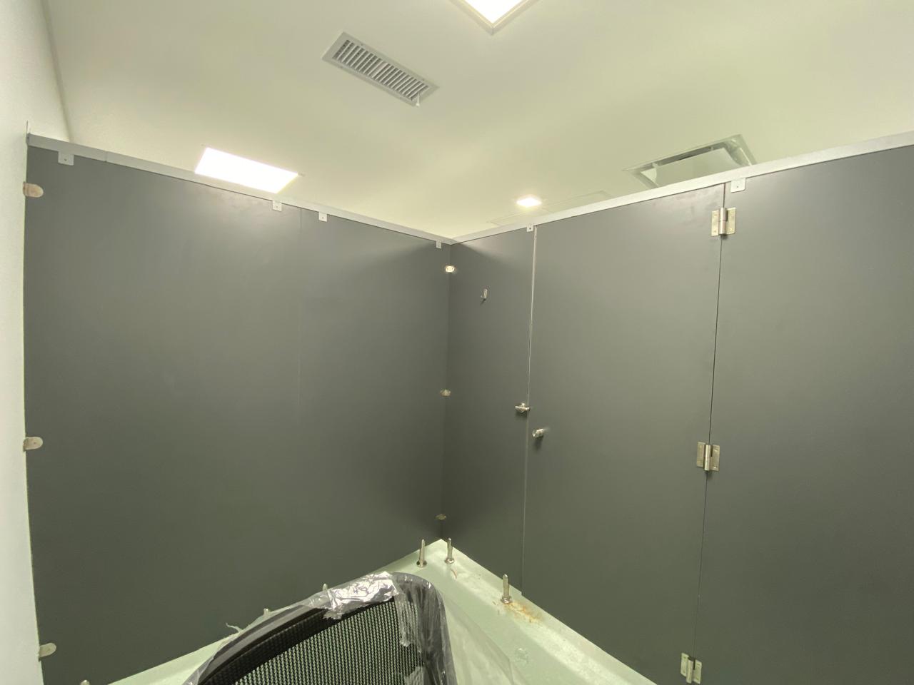 Lo que ven en las fotos anteriores son los primeros pasos en todo el proceso realizado a lo largo de dos semanas, se tratan de unos Boxes diseñados para ser consultorios. En esta parte del proceso los paneles no tenían firmeza, y las puertas no estaban colocadas, pero pueden observar los paneles y los materiales con mayor precisión. Utilizamos melamina de 18mm en color Gris Grafito, patas metálicas regulables de 10cm de altura; los paneles fueron fijados a las chapas del durloc como un primer paso hacia la estabilidad final.