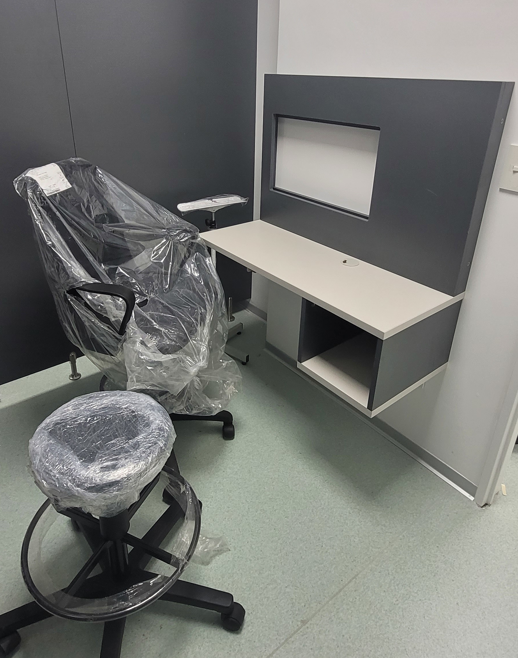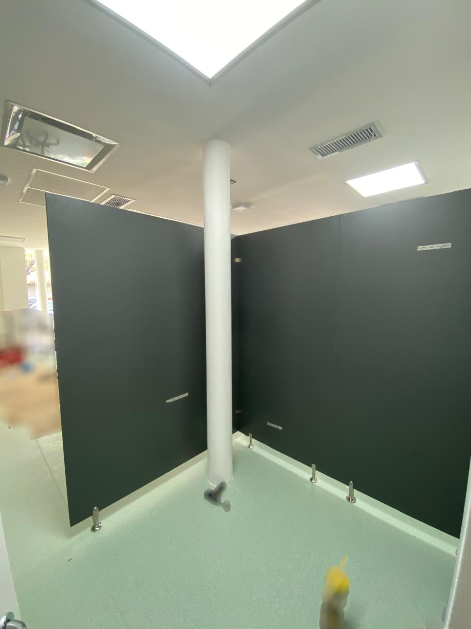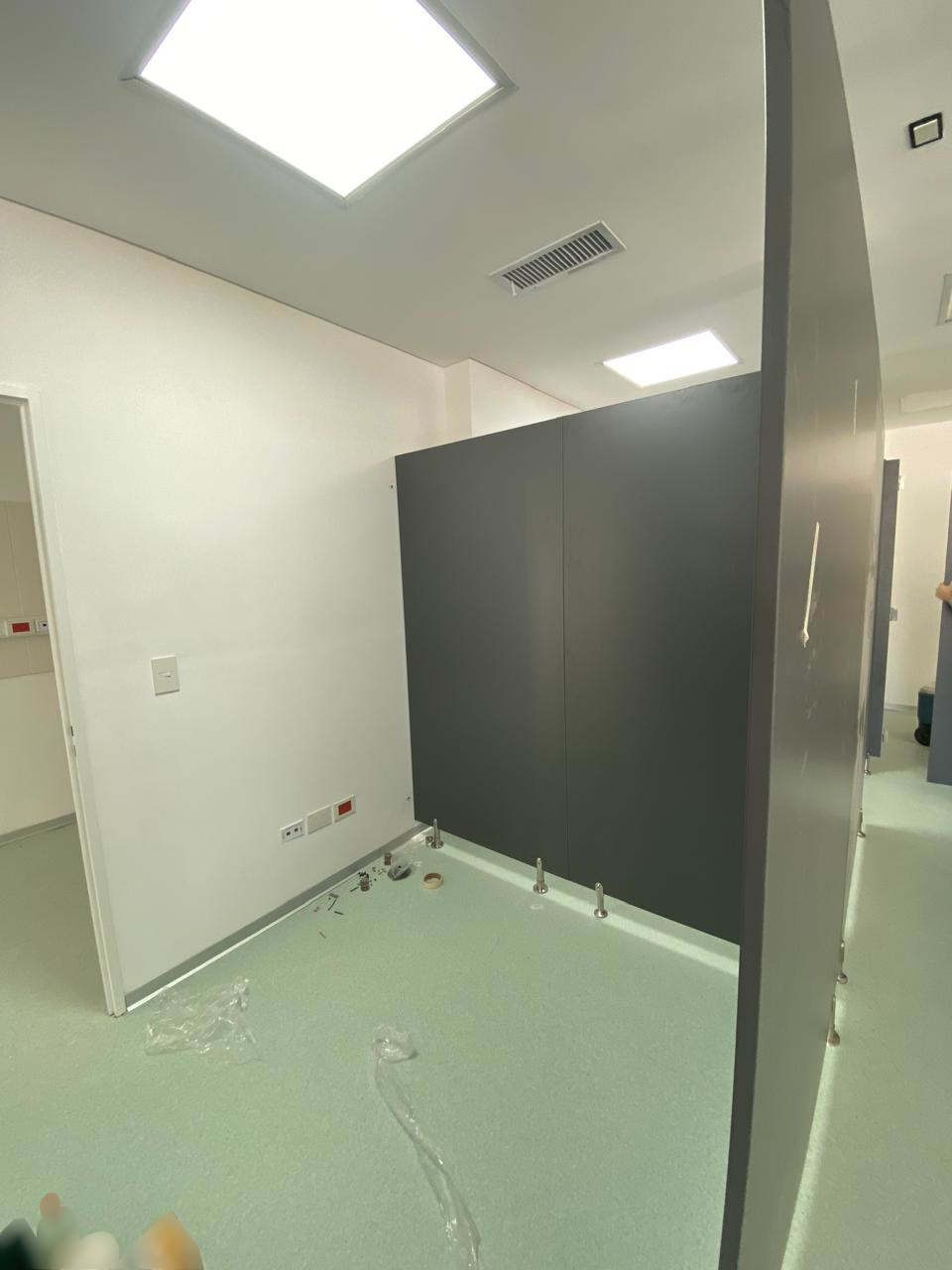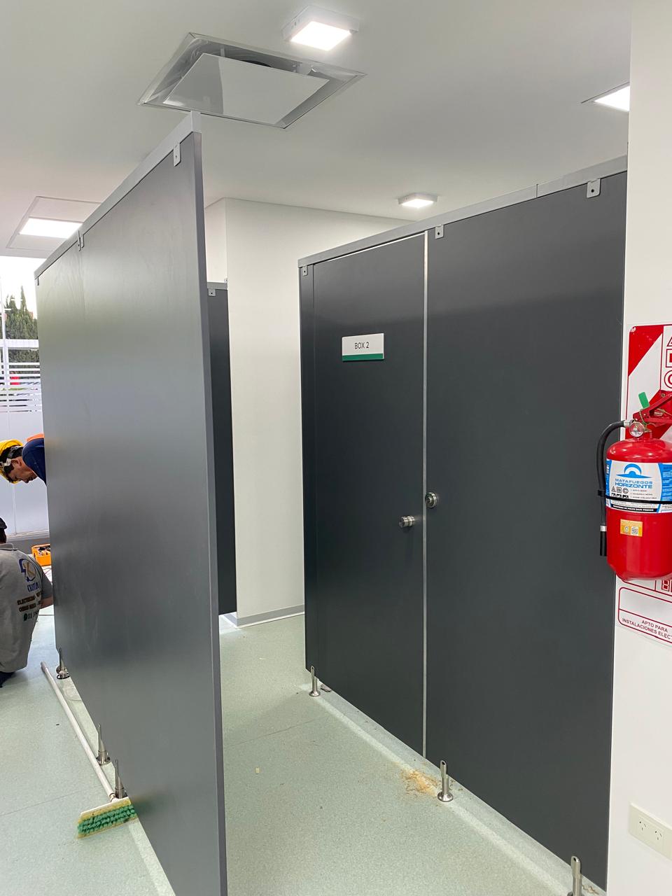 Lo que ven en las fotos anteriores son los primeros pasos en todo el proceso realizado a lo largo de dos semanas, se tratan de unos Boxes diseñados para ser consultorios. En esta parte del proceso los paneles no tenían firmeza, y las puertas no estaban colocadas, pero pueden observar los paneles y los materiales con mayor precisión. Utilizamos melamina de 18mm en color Gris Grafito, patas metálicas regulables de 10cm de altura; los paneles fueron fijados a las chapas del durloc como un primer paso hacia la estabilidad final.