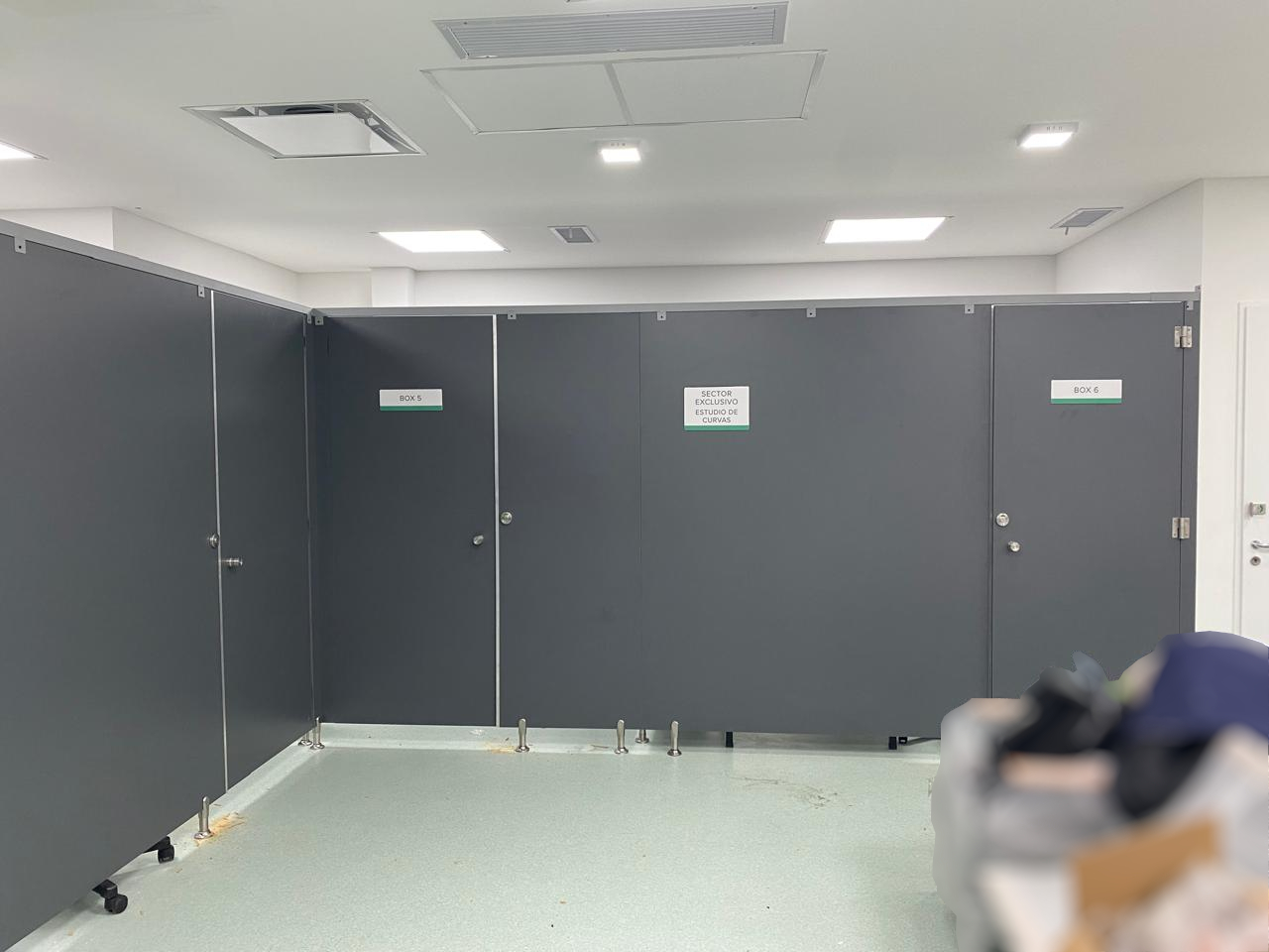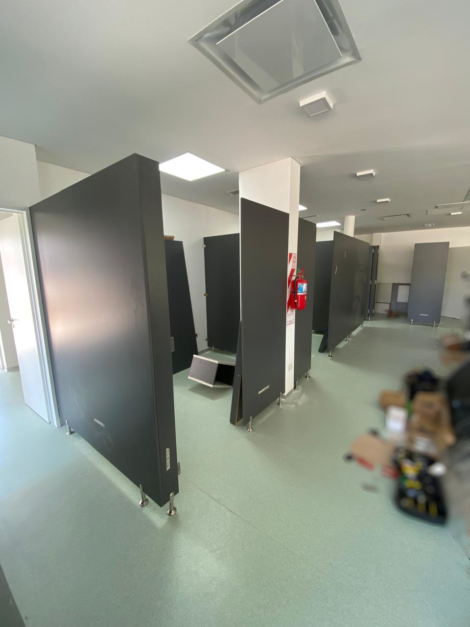 Este es el resultado final. Cinco boxes producidos en Melamina de 18mm, color Gris Grafito. Algunos accesorios de boxes de vestuarios fueron adaptados para esta obra, como lo son las patas metálicas de 10cm de altura.