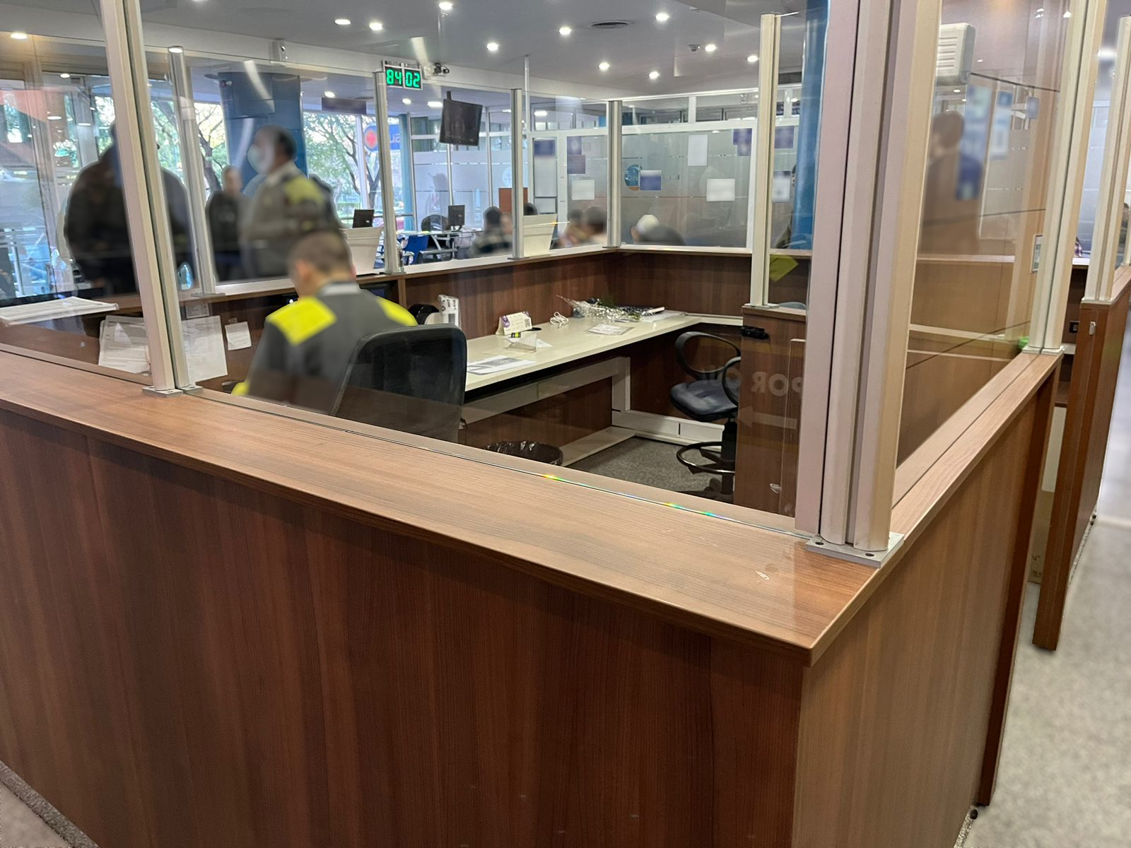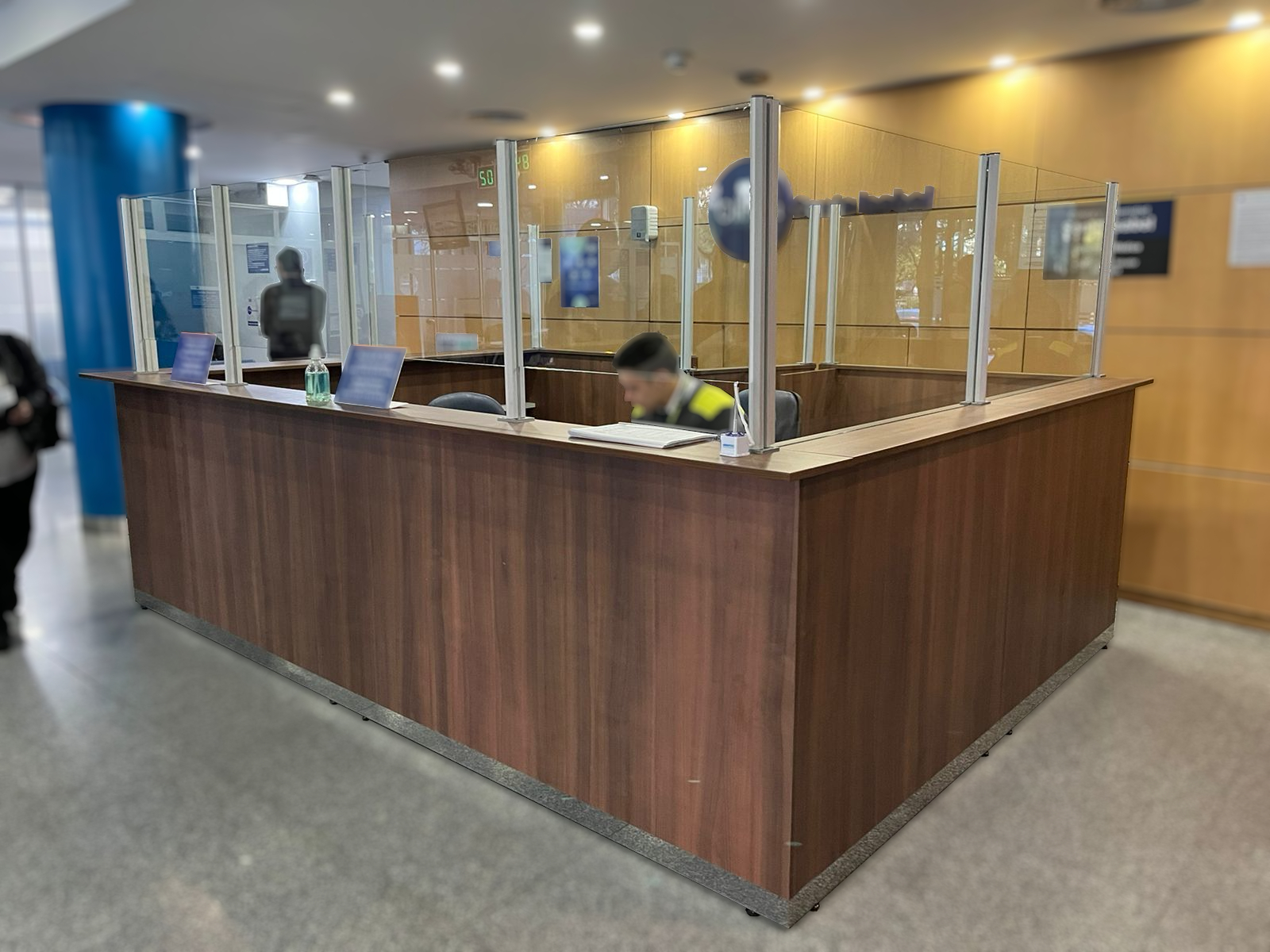 El diseño tiene una apertura inferior en el frente, para permitir el intercambio de papeles entre el cliente y la recepción.