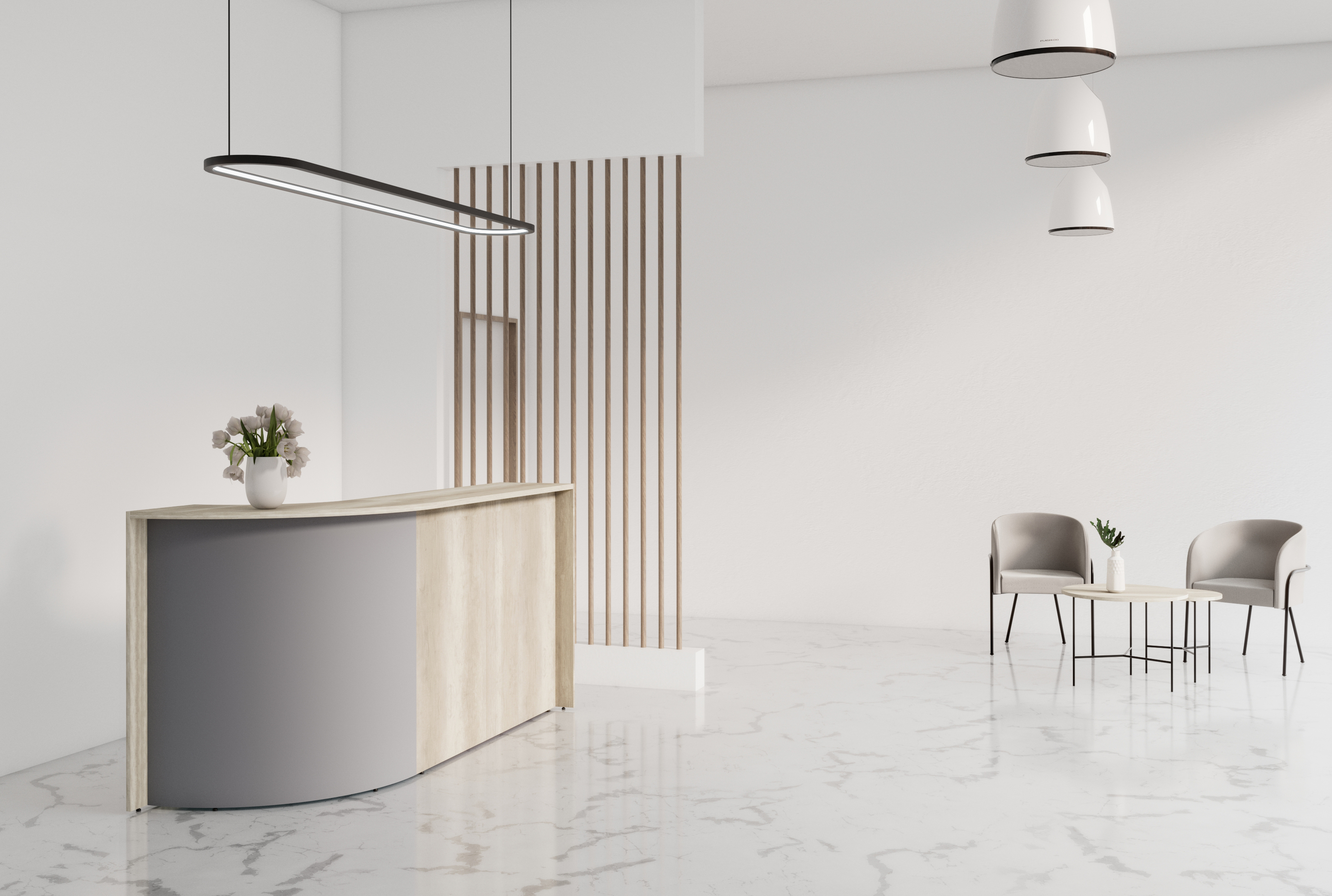 Este producto presenta tres variables de tamaño y forma, pero lo que lo hace particular es su esquina redondeada. Una de sus variaciones es en forma de "U", lo que permite tener un amplio espacio de trabajo y presentar varios frentes para la atención al público. Otra variante es en forma de "L", mientras que su forma básica es un escritorio estándar con un esquinero redondeado, dandole un toque único al diseño.